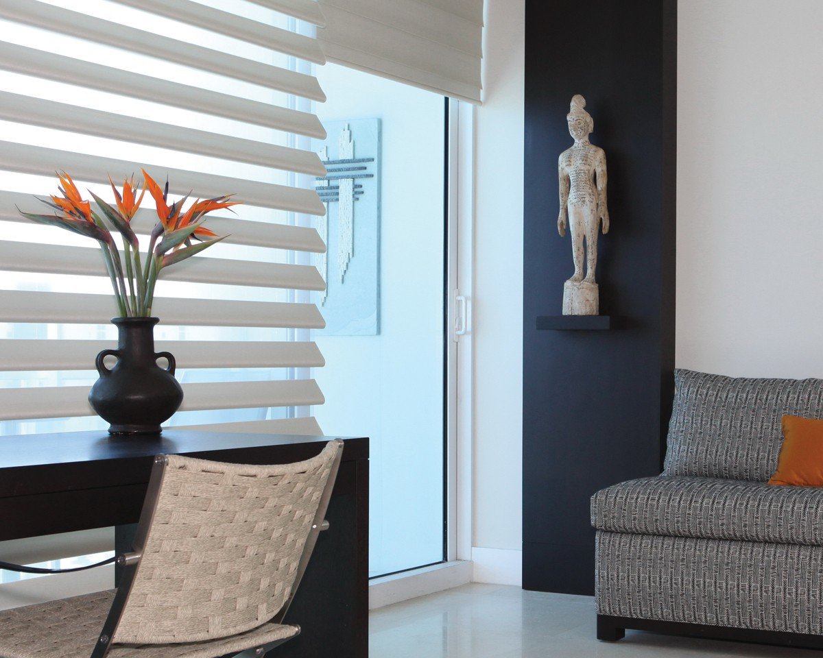 The sheer offers an unobstructed view when the shade is open. Close the shade for total privacy and room darkening comfort. You have to see the new metallic satin fabrics. They are perfect with sleek, contemporary settings. Pirouette shades bring elegance and sophistication in traditional, transitional and modern decor.